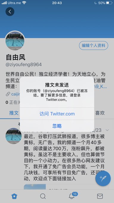 希望大家帮忙转发,找回失去的网友!同时我也在申诉,并联系媒体报道!不排除法律起诉的选项! 今天封我,后面可能会封任何批评中共的平台!希望推特作恶不要太离谱